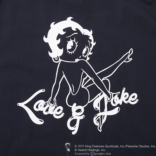 ブランドのコンセプト“LOVE & JOKE”にベティーちゃんが腰掛けながら振り向く、艶かしいスペシャルなグラフィックがバックにプリントされています。