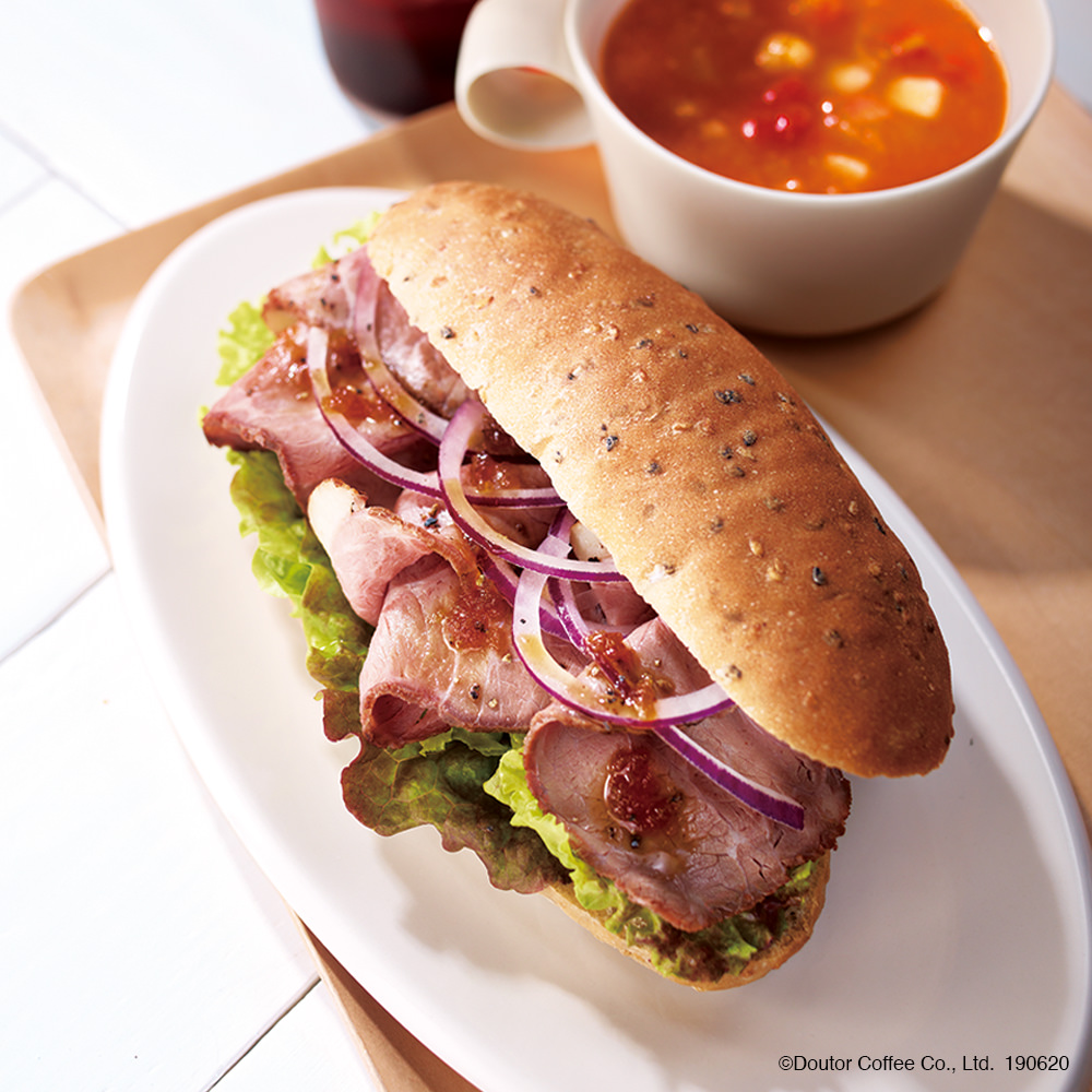 しっとりしたうま味のあるローストビーフに、さっぱり感のあるオニオン入りのしょうゆベースのソースをかけ、ブラックペッパーで味を引き締め、ごまの香り豊かなオリジナルのセサミブレッドでサンドしました。