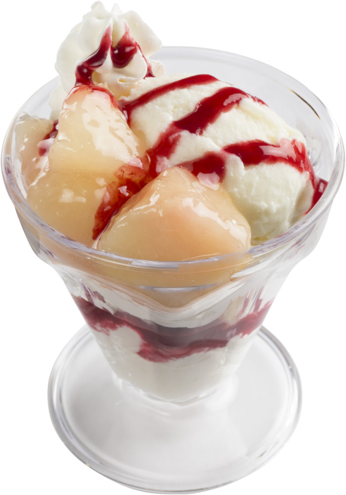上品な甘さの白桃と、爽やかな酸味のバニラヨーグルトアイス、甘酸っぱいフランボワーズソースが相性抜群。