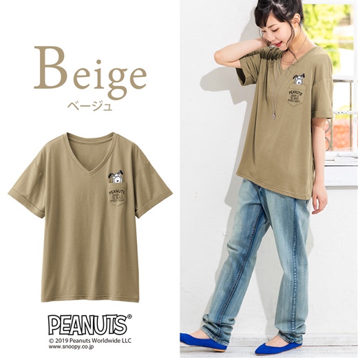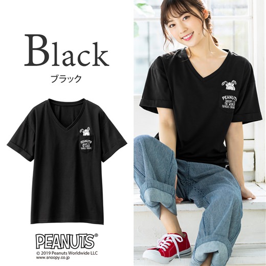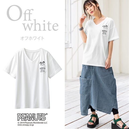 デコルテを綺麗見せしてくれるVネックの「スヌーピー」デザインTシャツ。