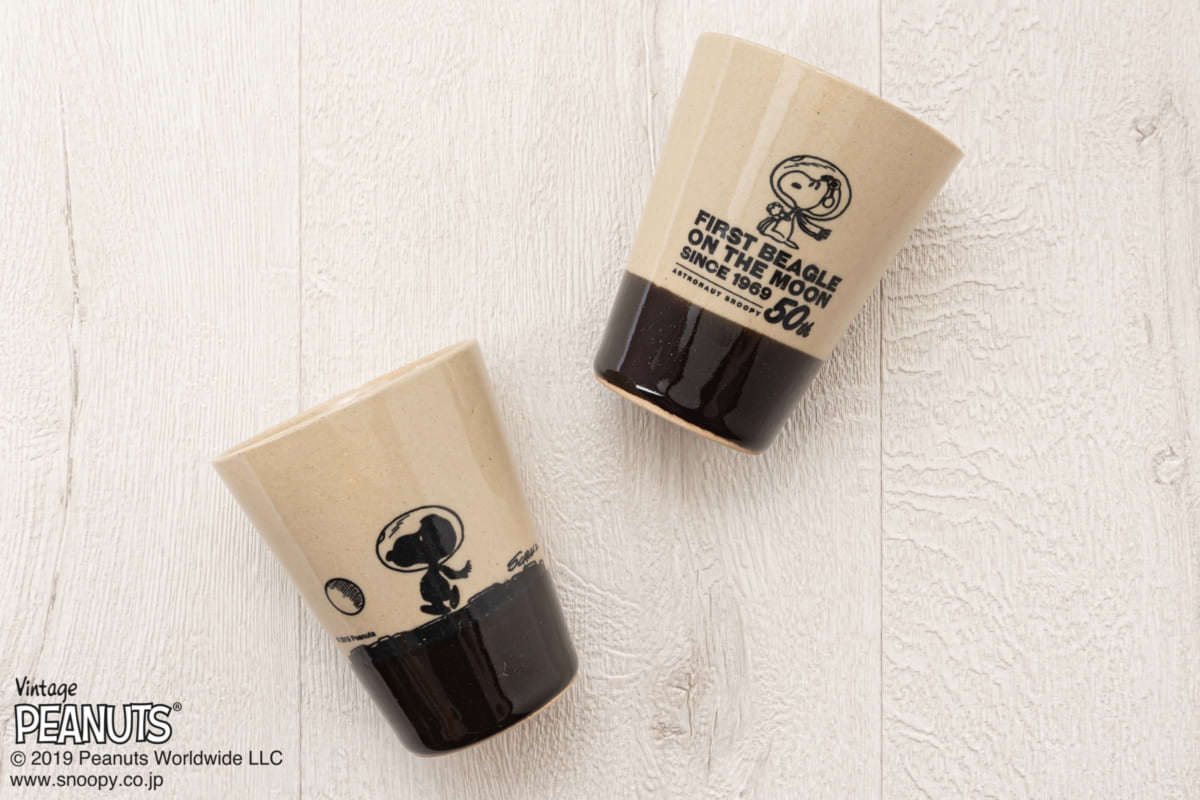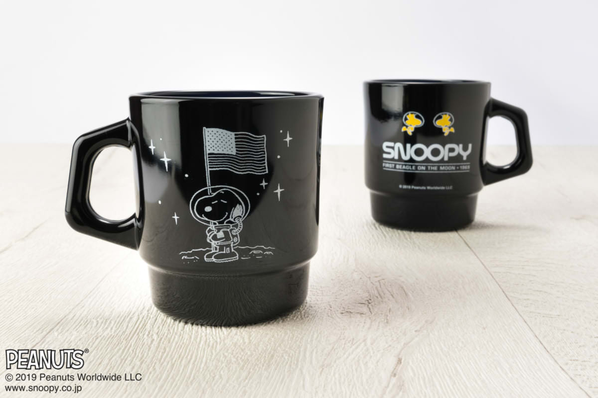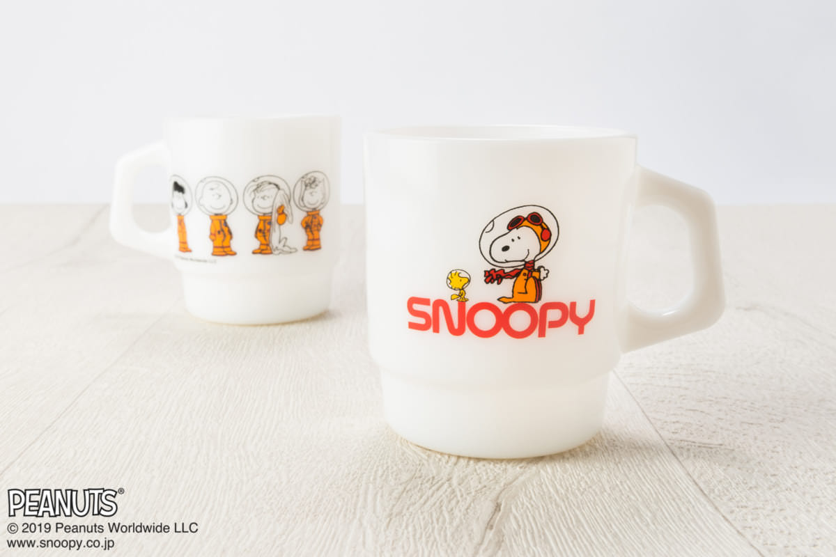 アストロノーツスヌーピー50周年をお祝いして、ブラックとミルクホワイトの2つの Fire-King スタッキングマグが登場。