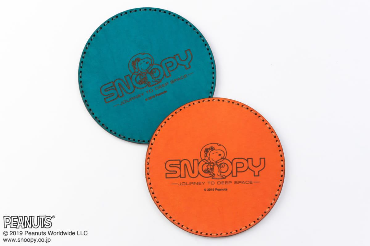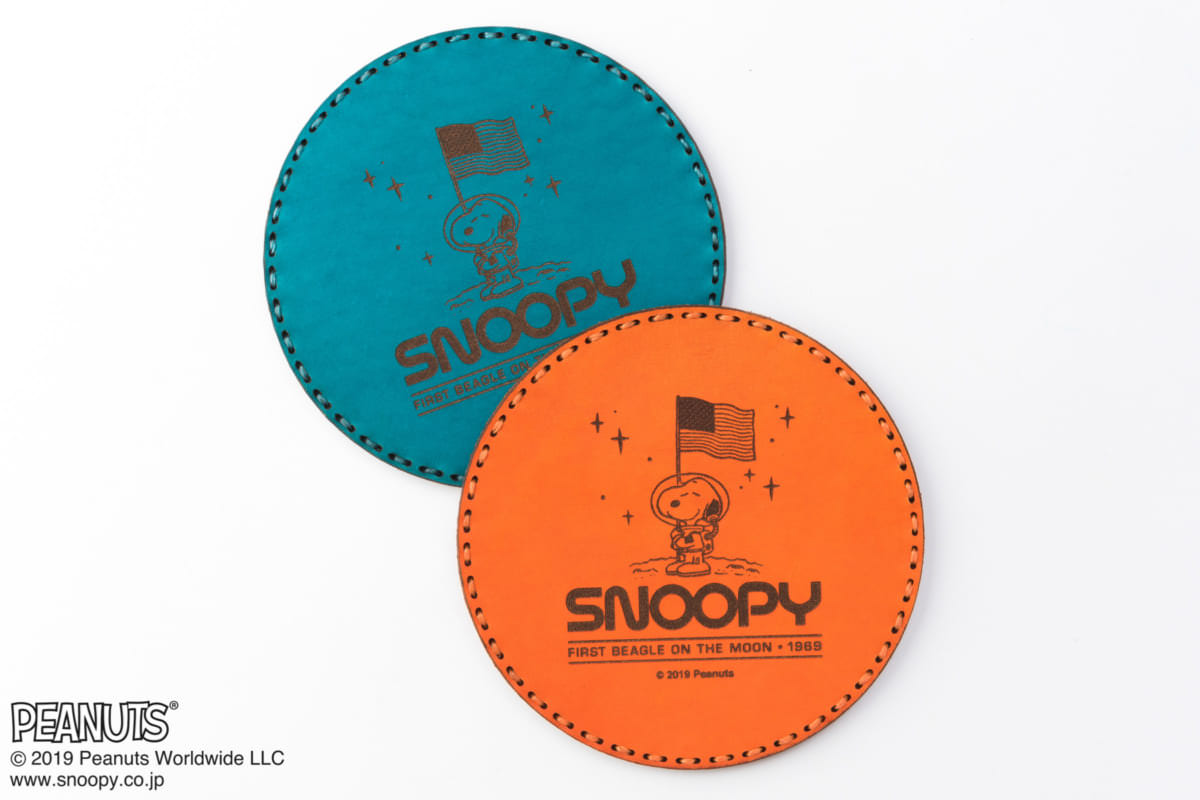 「アストロノーツスヌーピー」50周年をお祝いして、月や惑星をイメージしたオレンジとブルーグリーンの丸型レザーに、スペーススーツを着たアートをそれぞれレーザー刻印により描き出されています。