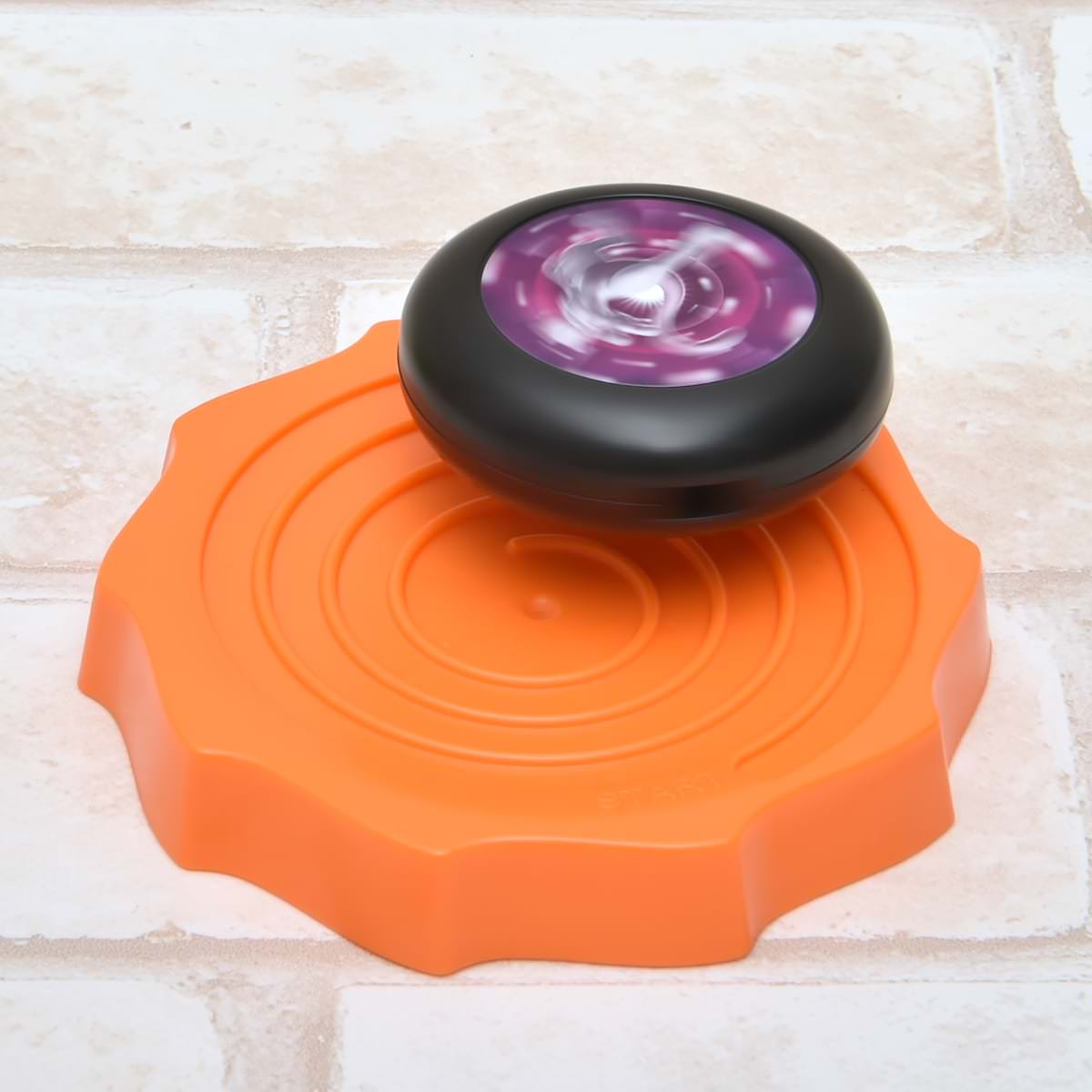 黒いコマの中に息を吹き込んで、オレンジのプレートの上に置くと、コマが回り始めて、真ん中のゴールに向けて進んでいきます。