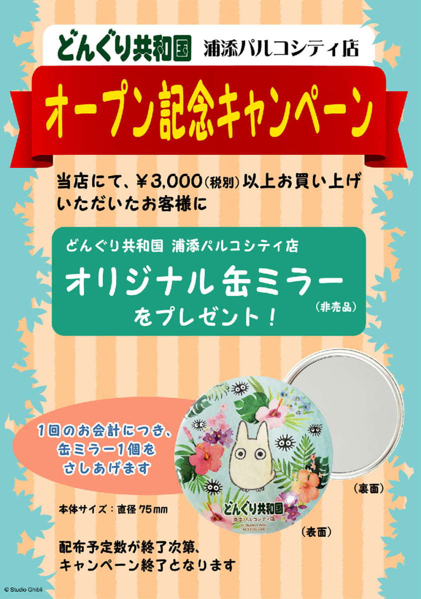 オープン記念として、どんぐり共和国浦添パルコシティ店限定の「オリジナル缶ミラー」を税別3,000 円以上購入された方にプレゼント。