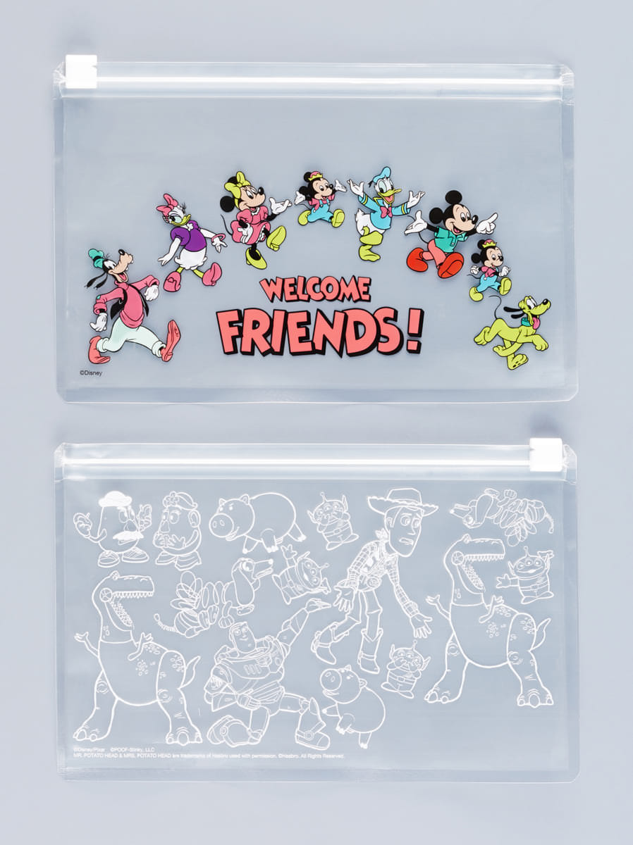 「ディズニー」のクリアポーチはトレンドのレトロ&ポップなテイストのキャラクター柄がカラフルな「ミッキーマウス」と仲間たちの愉快なデザインを採用。