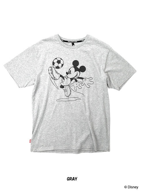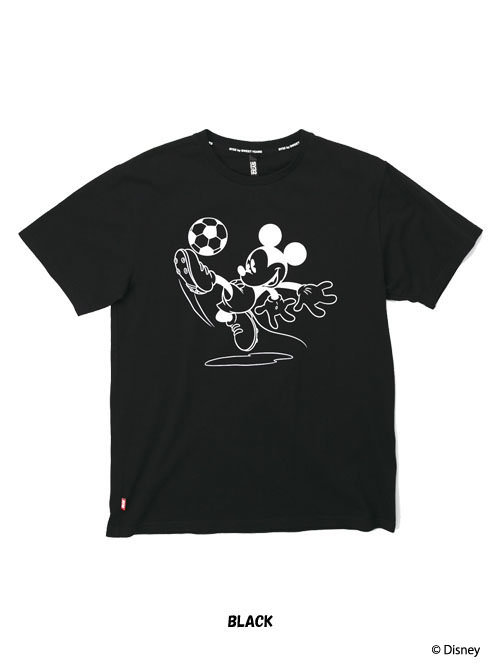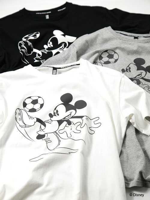 フロントに、パイカットアイの「ミッキーマウス」がサッカーをしているシーンがデザインされた、シンプルなシルエットのTシャツです。