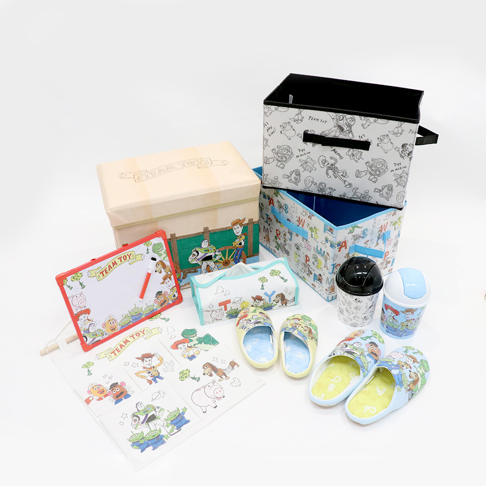 マイルームなどを「トイ・ストーリー」カラーで統一できる、収納アイテムやリビンググッズ。