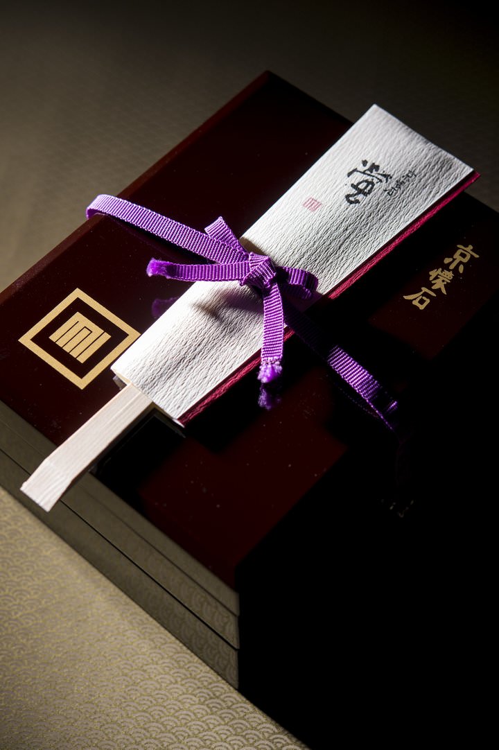 京都三大祭のひとつ、祇園祭「くじ改め」にちなんだ結び方で結われた二段重。