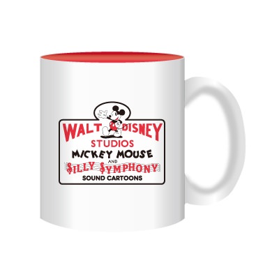 「ミッキーマウス」とロゴが大きくデザインされたマグカップ。