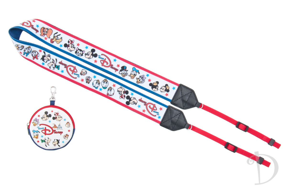 「ミッキーマウス」たちキャラクターのお顔がデザインされたカメラストラップ。