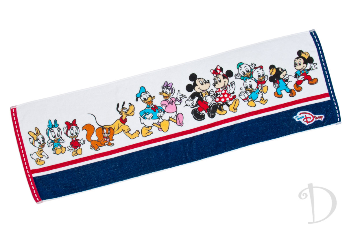 「チーム Disney!」の大きなロゴに、キャラクター、東京ディズニーランドのシンデレラ城や、東京ディズニーシーのプロメテウス火山もデザインされたウォッシュタオル。