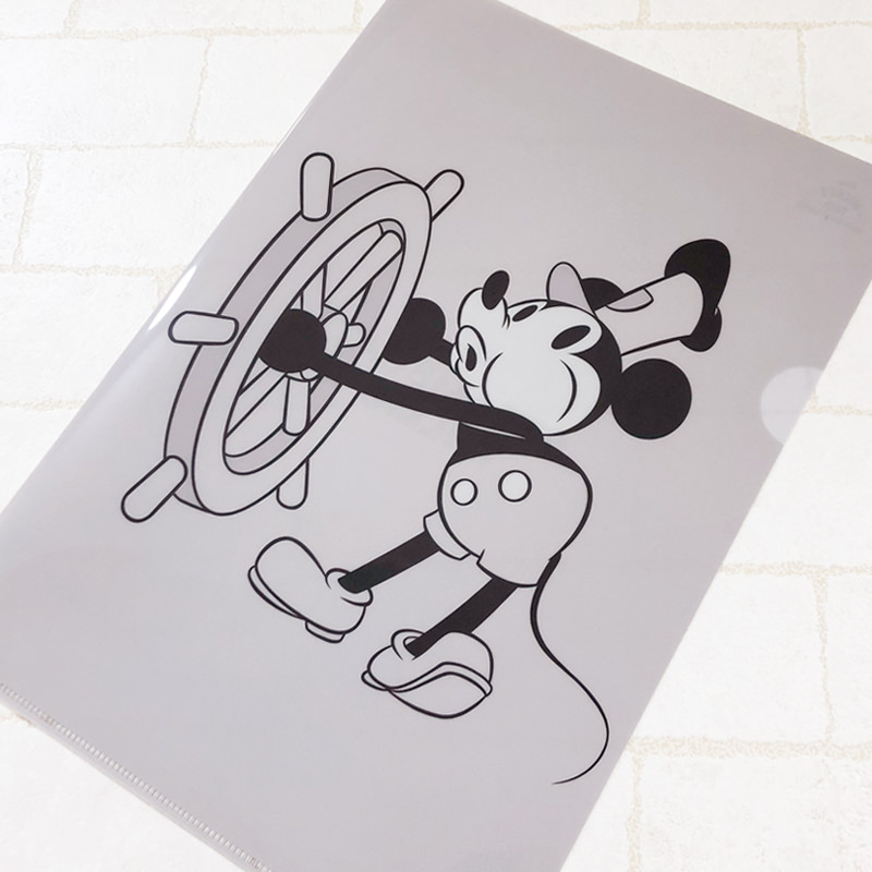 『蒸気船ウィリー』の作中にも登場する、楽しそうな表情で舵をきる「ミッキーマウス」がデザインされたクリアファイル。