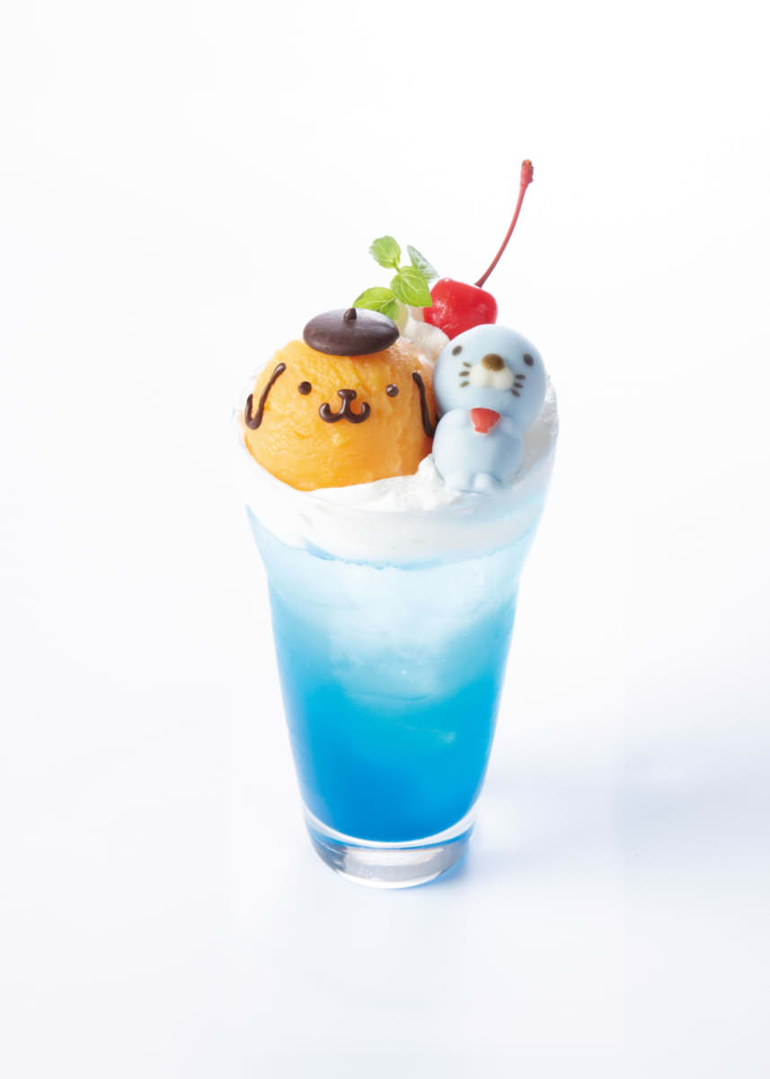 ブルーキュラソー+グレープフルーツシロップをソーダで割り、ホイップクリームの上にマンゴーアイスの「ポムポムプリン」とマシュマロの「ぼのぼの」がのっています。