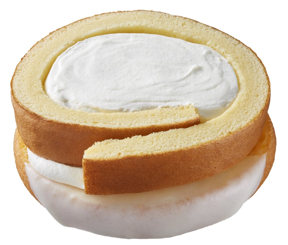 ホワイトチョコをコーティングしたふわっとかるいドーナツと、しっとりとしたロールケーキ2層の生地に、北海道産牛乳入りのミルククリームをたっぷりと絞ってあります。