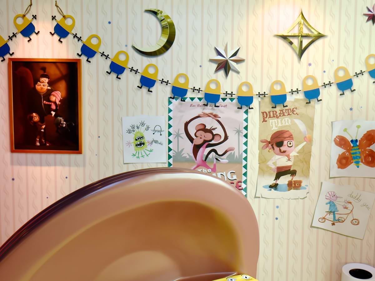 ユニバーサル・ピクチャーズ/イルミネーション・エンターテイメントの大ヒットを記録したアニメ映画「怪盗グルーのミニオン危機一発」に登場する、グルーのもとで暮らす3姉妹(マーゴ、イディス、アグネス)の3姉妹の部屋を忠実に再現した『ミニオンルーム 2 ~アグネスたちのお部屋~』