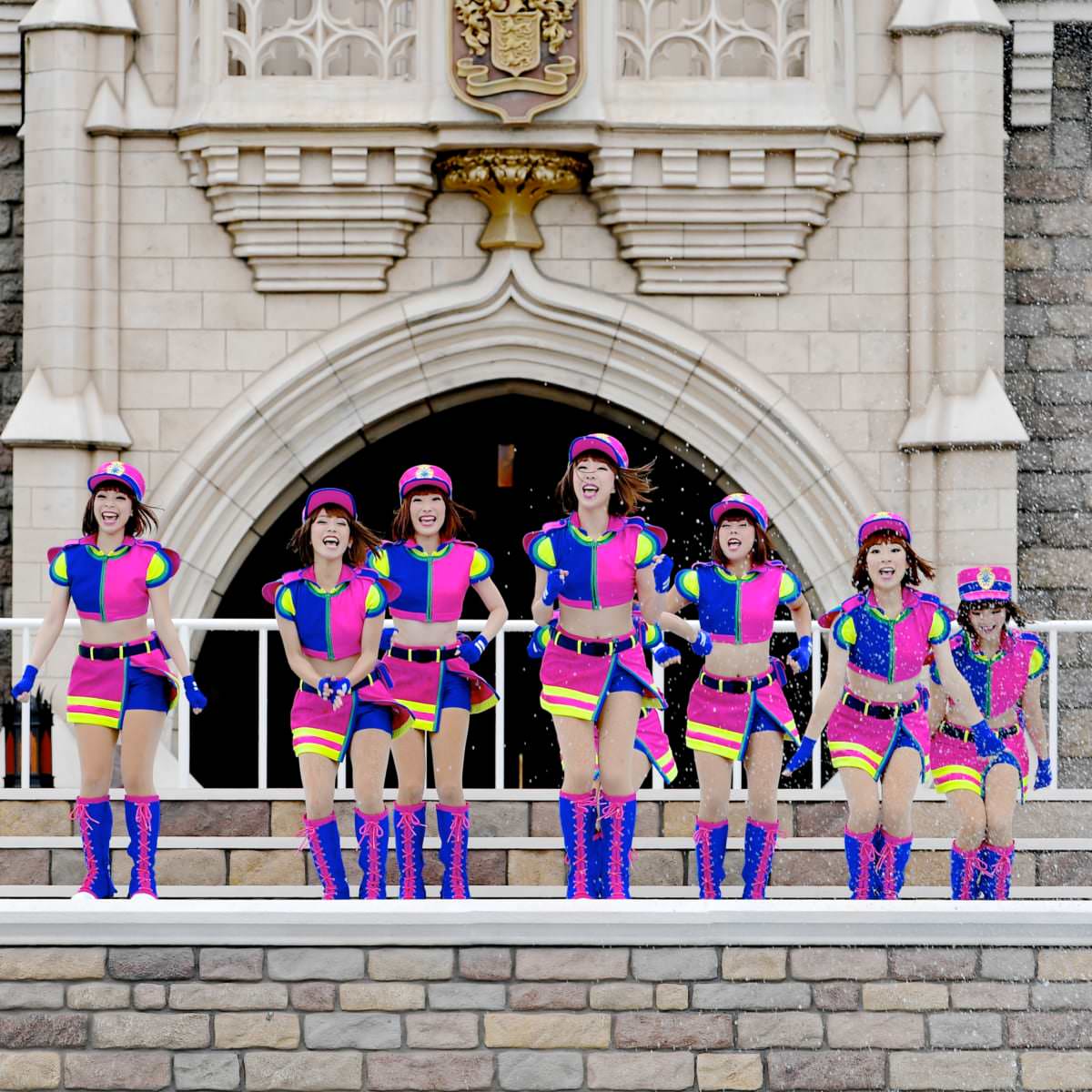 連続した水しぶきが上がる中、手拍子や振り付けを交えてゲストを誘い、みんなで元気に歌い踊ります。