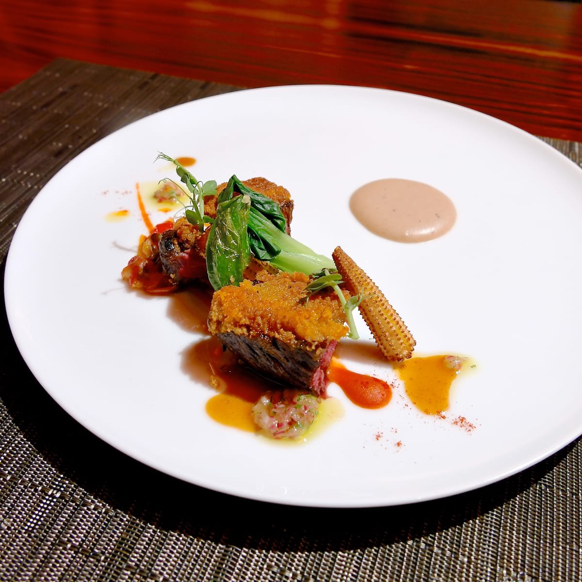 このほかに、「スパイスでマリネしたアオリイカ 梅とキュウリのスープ」と「帆立貝の炙りとトウモロコシのわらび餅 レモングラス風味のコンソメジュレ」、「アイナメのスチーム 干し海老とキャベツのブレゼ つるむらさきの餡」が提供されます。