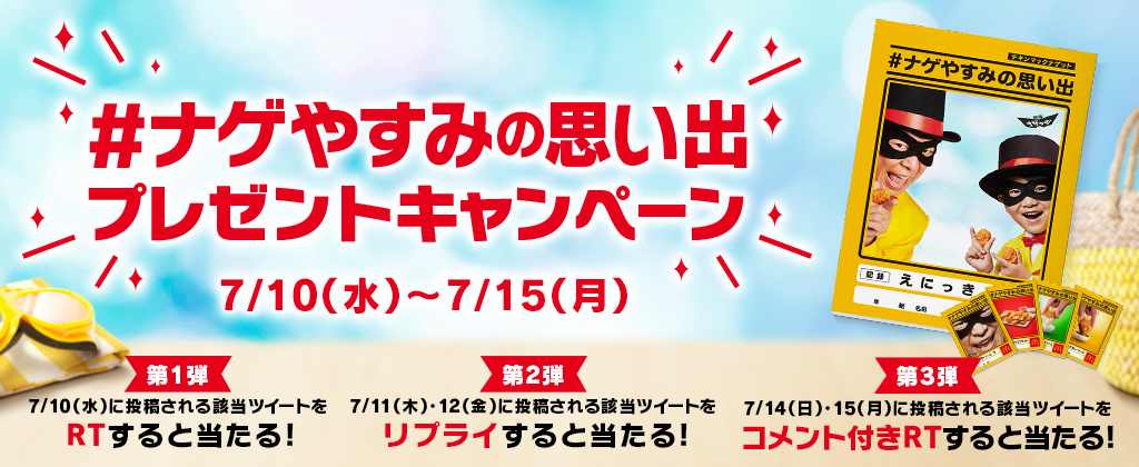 応募方法:マクドナルド公式Twitterアカウント(@McDonaldsJapan)をフォローし、キャンペーン対象のツイート(「#ナゲやすみの思い出」のハッシュタグが付いた投稿)に対して、第1弾ではリツイート、第2弾ではリプライ、第3弾ではコメントを付けてリツイート