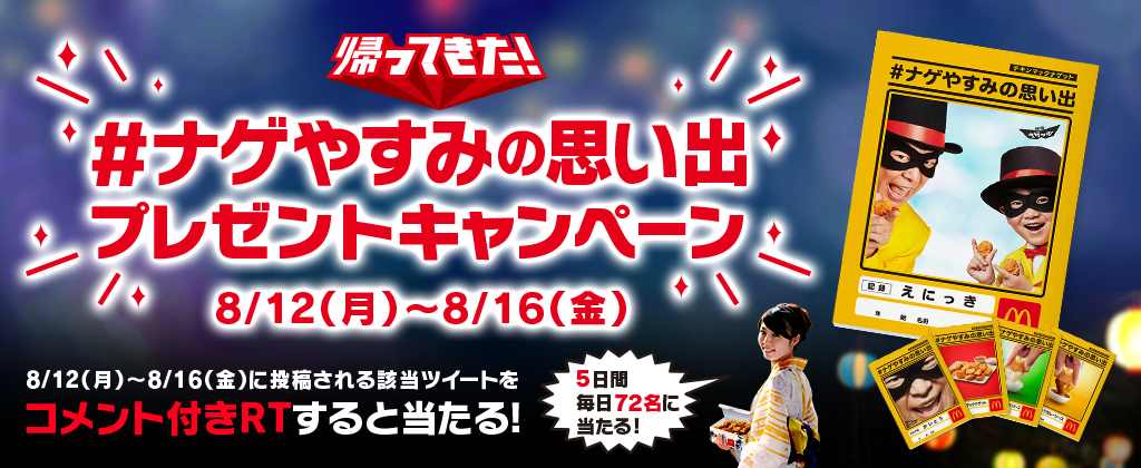 応募方法:マクドナルド公式Twitterアカウント(@McDonaldsJapan)をフォローし、キャンペーン対象のツイート(「#ナゲやすみの思い出」のハッシュタグが付いた投稿)にコメントを付けてリツイート