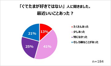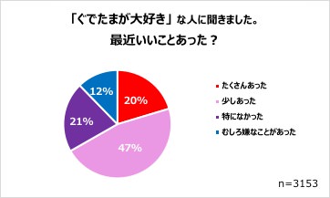 サンリオ公式サイト閲覧者を対象にしたサンリオキャラクターのアンケートで、ぐでたまを「大好き」なグループ中「最近いいことがあった」と回答した人の割合が、ぐでたまを「嫌い・どーでもいい」と回答したグループよりも高い、という結果が出ました。