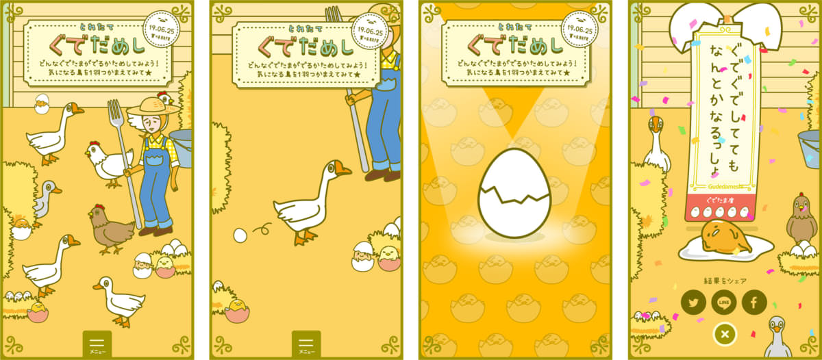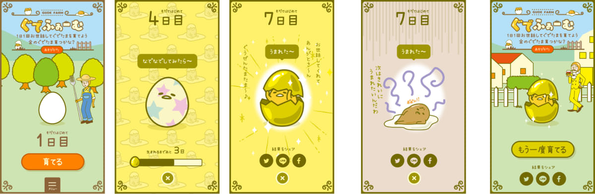 「ぐでふぁーむ」はユーザーが1日1回たまごをお世話しオリジナルの“ぐでたま育て”をするゲームで、お世話を続けると、育て方によって「金のぐでたま」や「双子のぐでたま」、育て方が悪いと「グレたま」が生まれるなど、育っていく姿を見守ることができます。