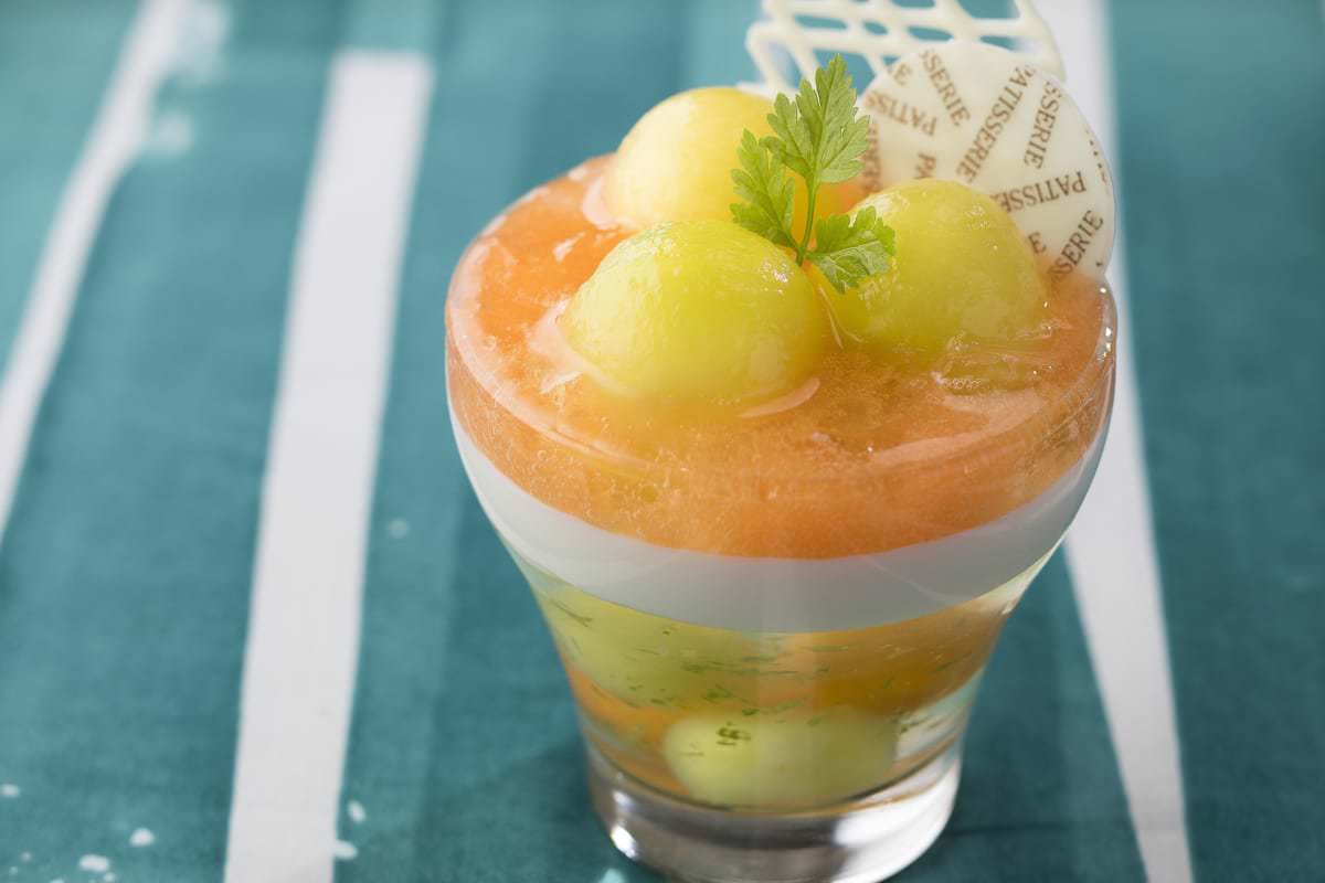 さっぱりしたライムのゼリーと甘いメロンのハーモニーがたまらない、ひんやりスイーツです。