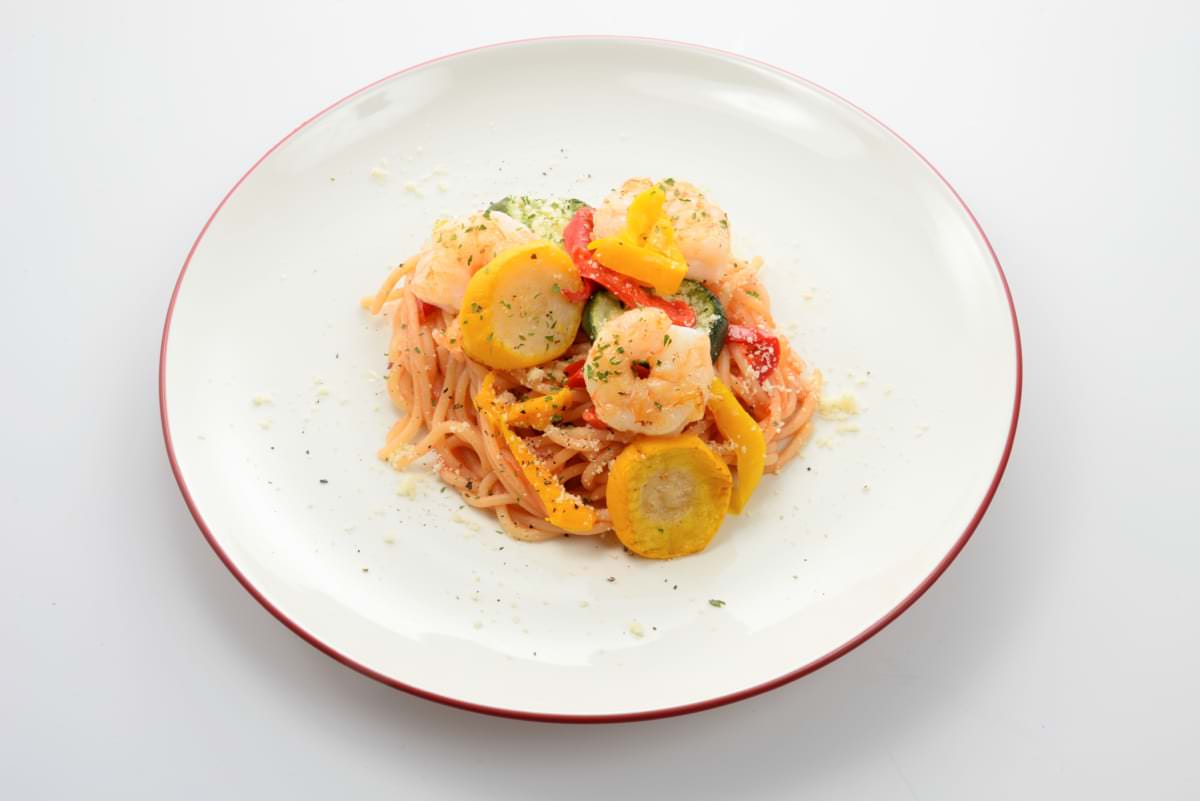 エビやズッキーニ、パプリカなどがふんだんにトッピングされています。