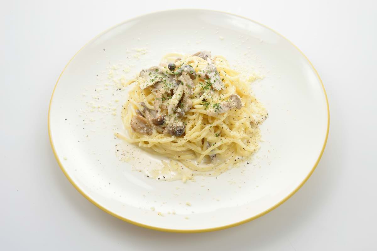 濃厚なクリームパスタには、たっぷりのキノコが和えられています。
