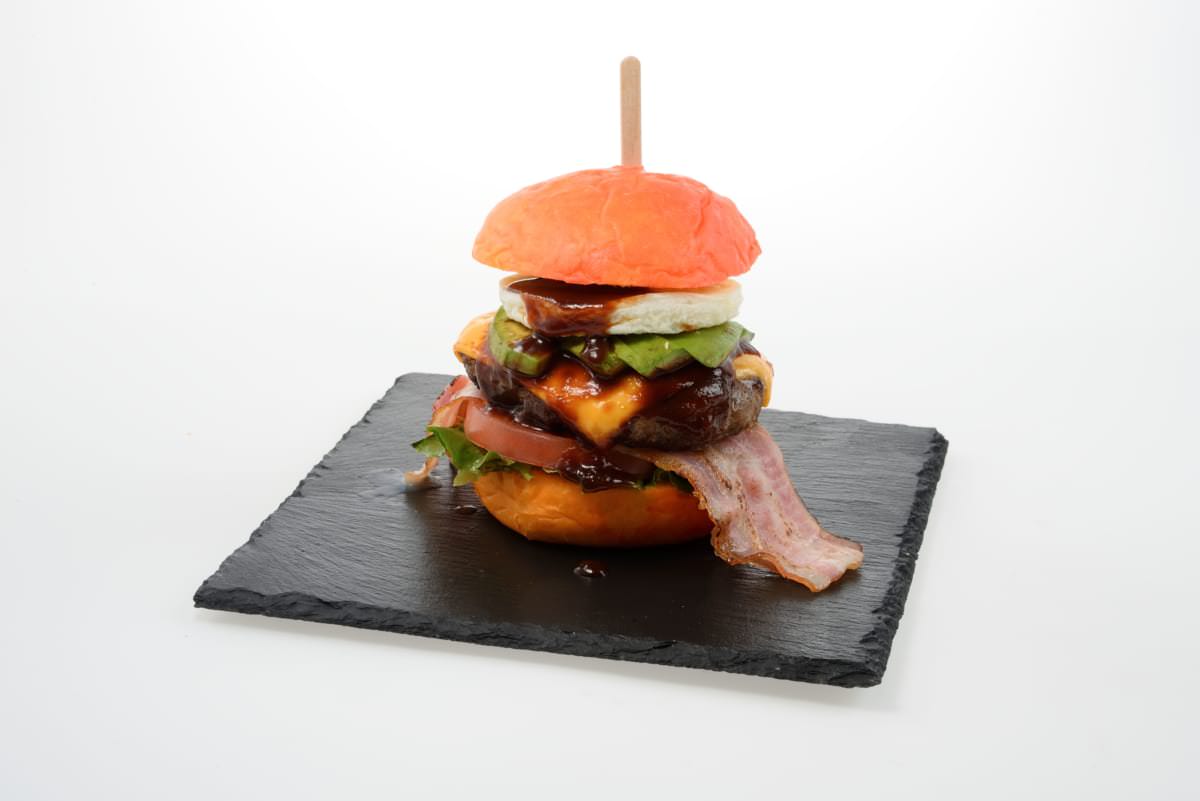 オレンジとピンクのバンズを使用した「MAZARIA バーガー」が登場!