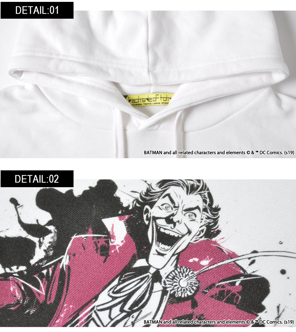 新たな犯罪を企んでいるような不適な笑みを浮かべる「ジョーカー」のデザインが目を引く、ビッグパーカー。