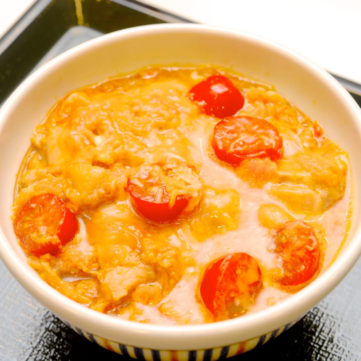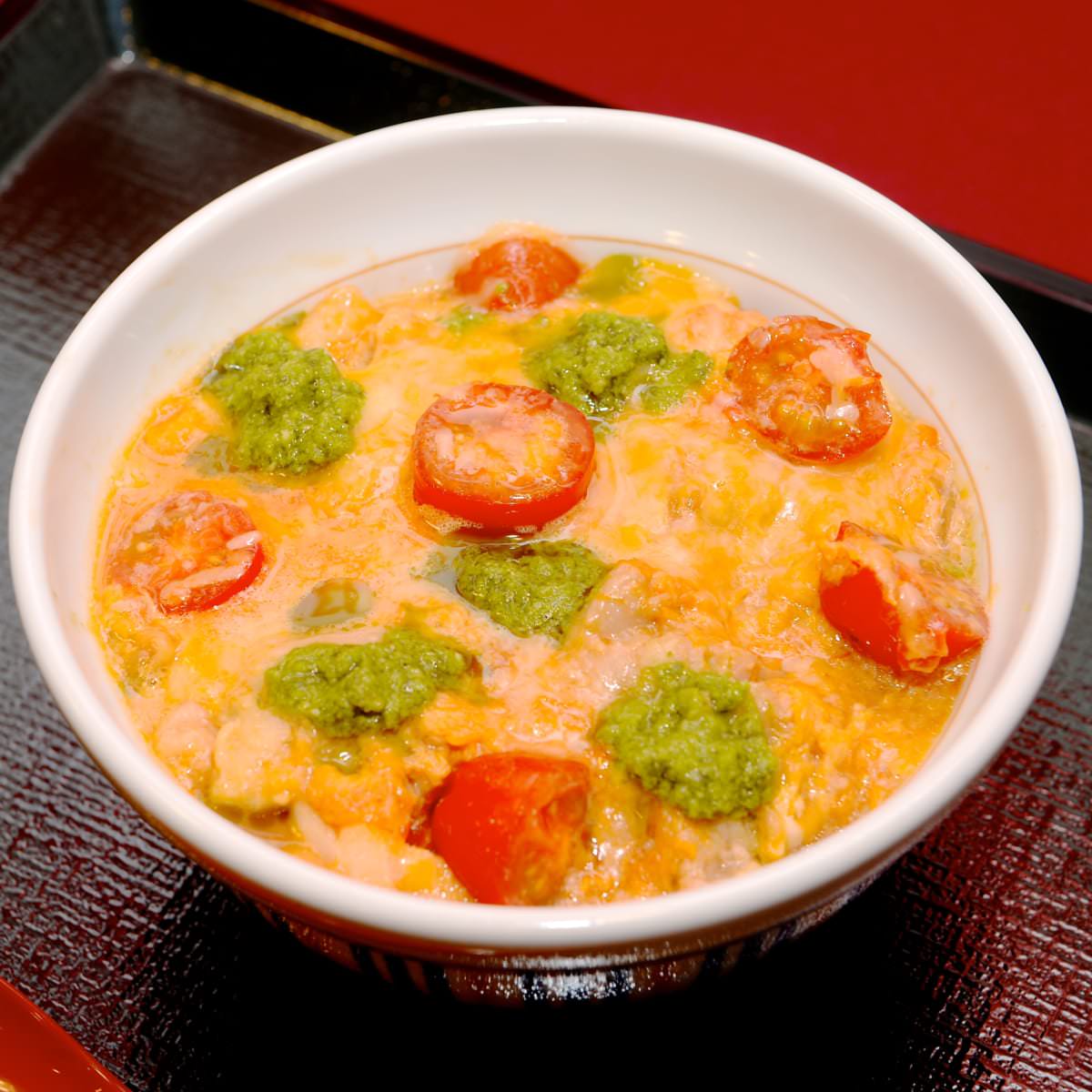 優しい味の特製の割り下の風味を壊さず、柔らかい鶏肉とふわとろ卵、フレッシュなトマトに、コクのあるバジルソースと濃厚なチーズが絡み合う、斬新な親子丼になっています☆