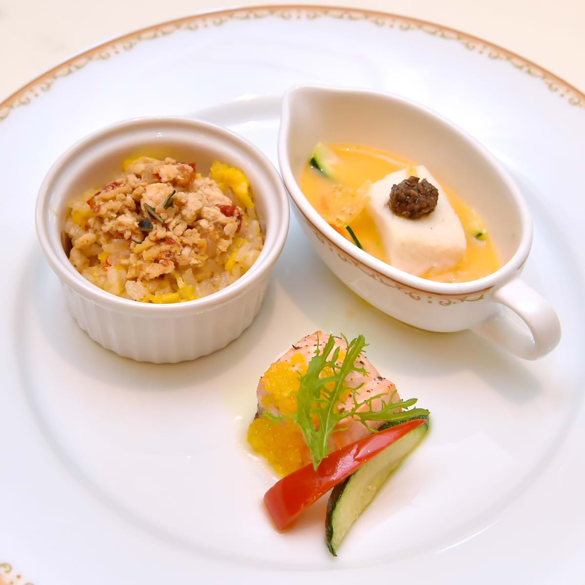 なめらかな豆腐のムースの上に、ピータンを使用したソースをトッピング。