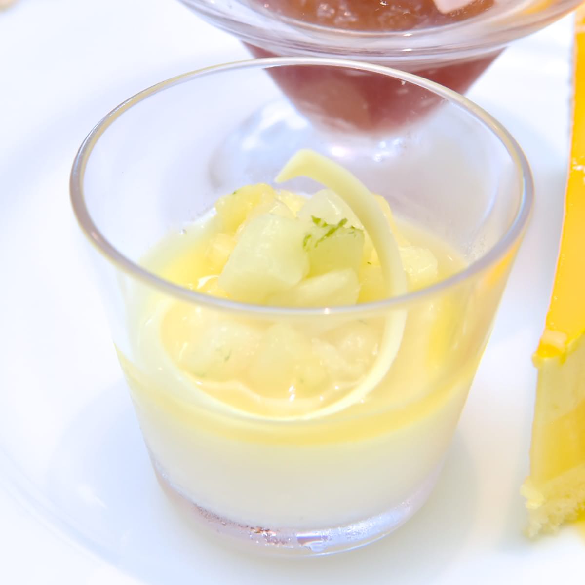 パイナップルのソースをかけて仕上げたパンナコッタ。