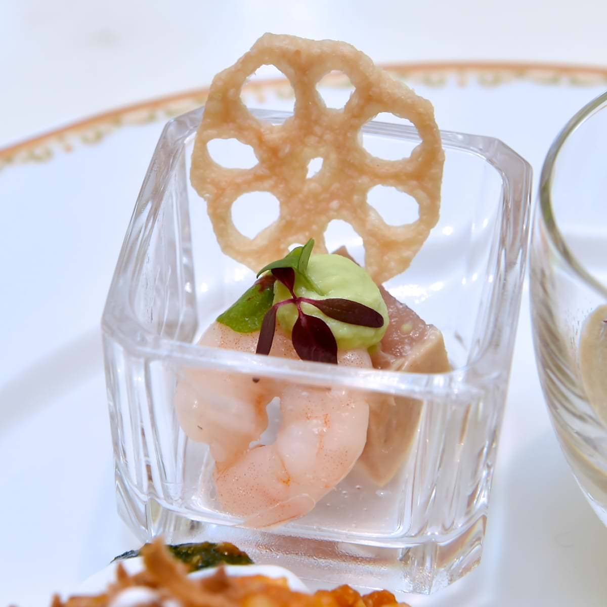 まぐろのたたきと海老を一口サイズでいただける、お口直しにもぴったりな一品。