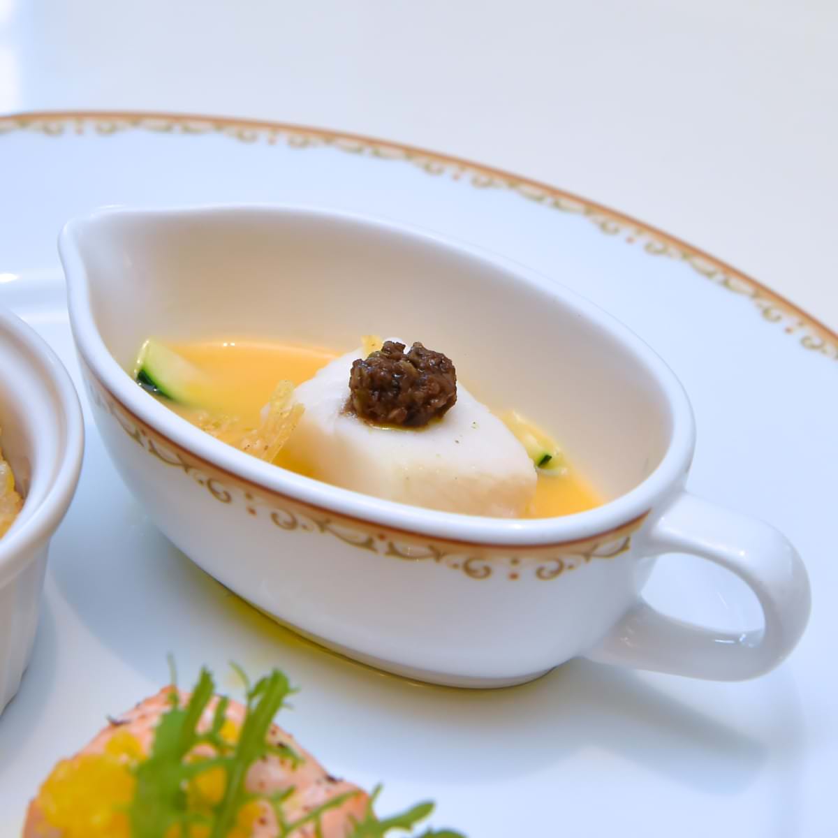 白身魚をスープ仕立てで味わうあたたかいお料理。