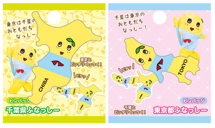 「ふなっしー」が千葉県と東京都の地形にアレンジされた「ピンバッジ」が登場。