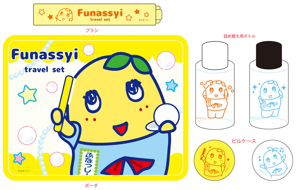 「ふなっしー」がプリントされたポーチにブラシや詰め替え用ボトル、ピルケースがセットされた「トラベルセット」