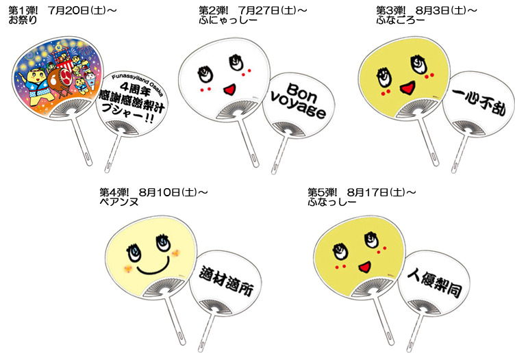 令和の大阪の夏いちばんの暑さで展開する今回のイベントでは「ふなっしー」の仲間たちのうちわが、週替わりの購入特典として登場します!
