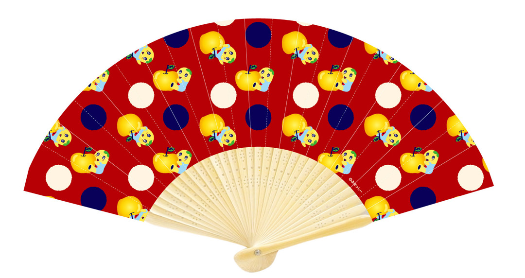 立体的にプリントされたジューシーな梨と一緒に「ふなっしー」がプリントされた「布扇子」