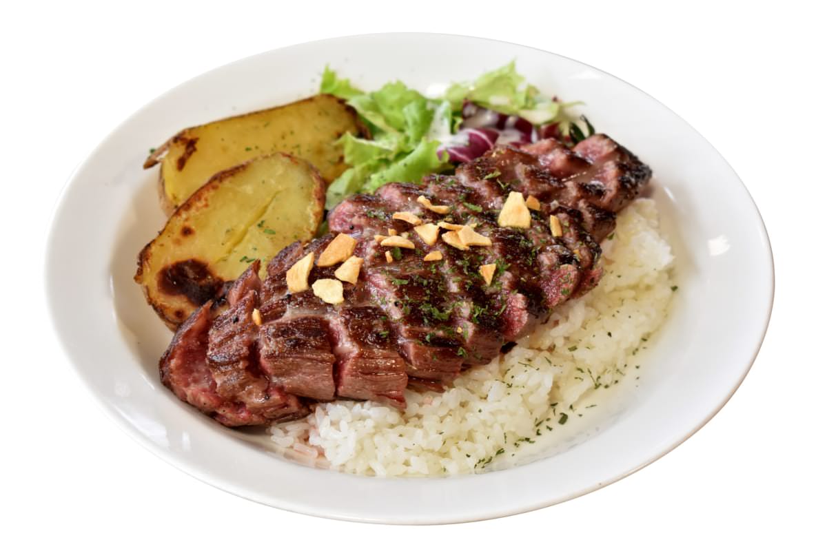 ミディアムレアで焼かれたガーリックステーキをお皿に盛りつけた「北海道牛のガーリックステーキライス」