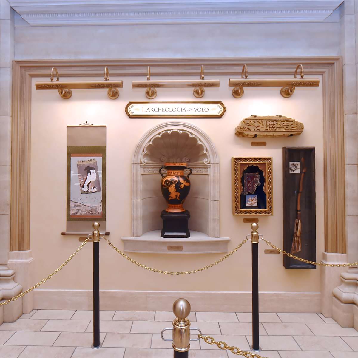 「考古学」のコレクションでは、じゅうたんやホウキなど、空を飛んだと考えられているアイテムを展示。
