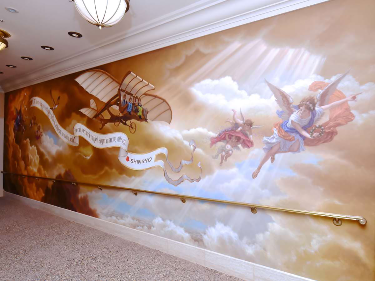 中庭に降りると、大空を夢見て挑戦し続けた先人たちの壁画がずらりと並んでいます。