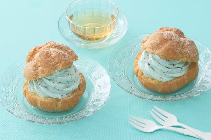 爽やかなチョコチップ入りミント風味ホイップクリームとまろやかなカスタードのWクリームが入ったシュークリーム。