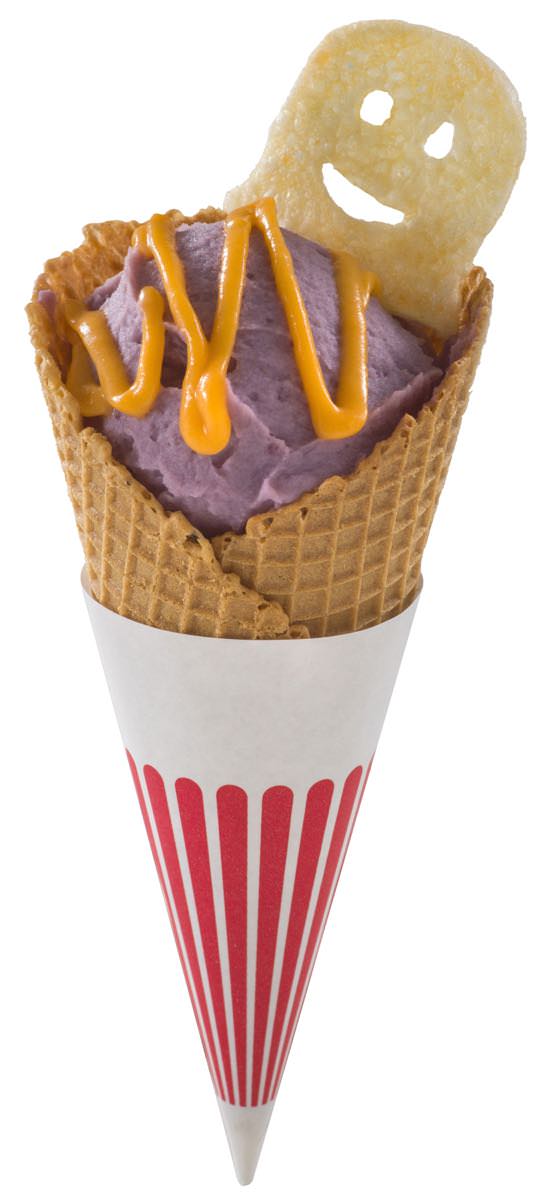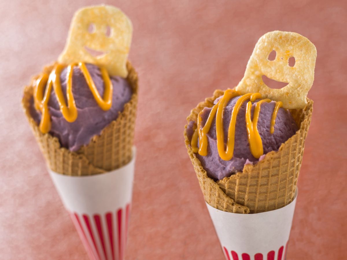 まるでアイスクリームのようなビジュアルが特徴の「牛カルビコーン(紫イモ・マッシュポテト)」