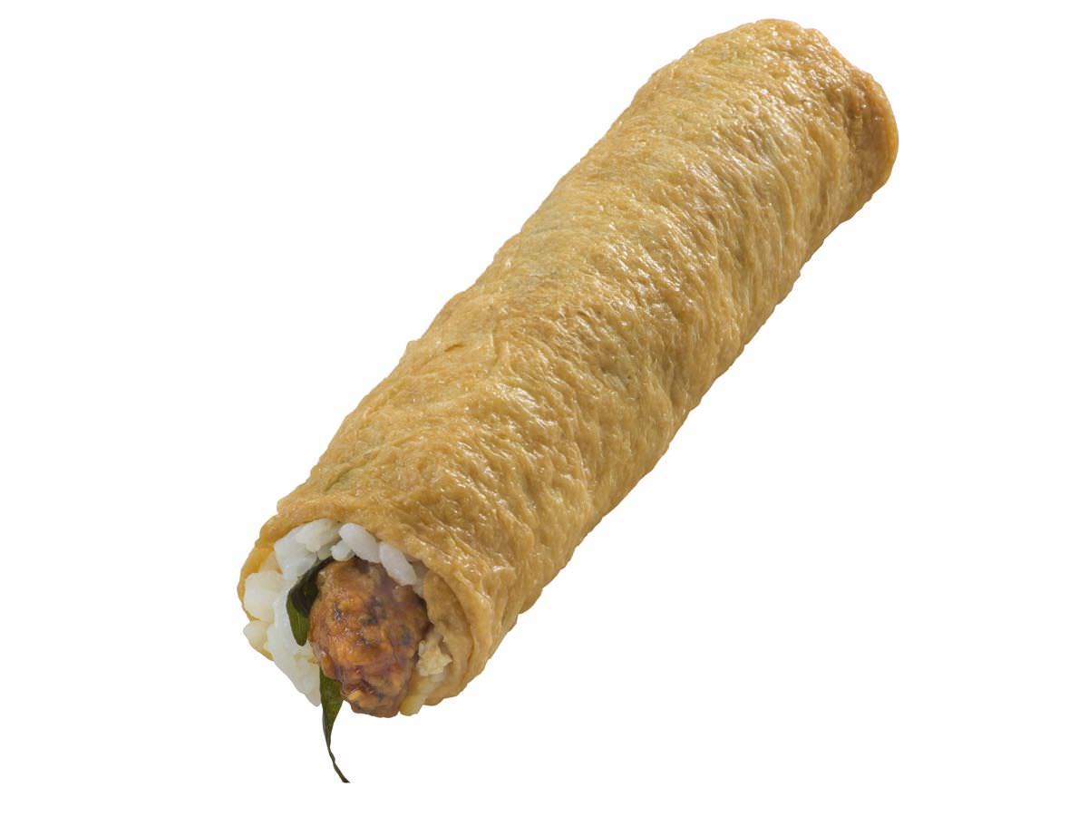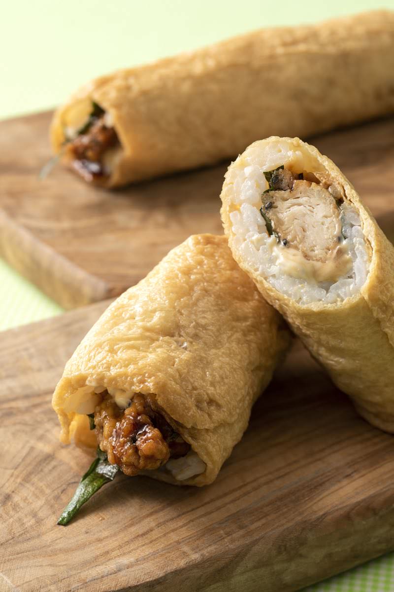 ジューシーな唐揚げをロングタイプのおいなりさんで包み込んだ、組み合わせがクセになるメニューです☆