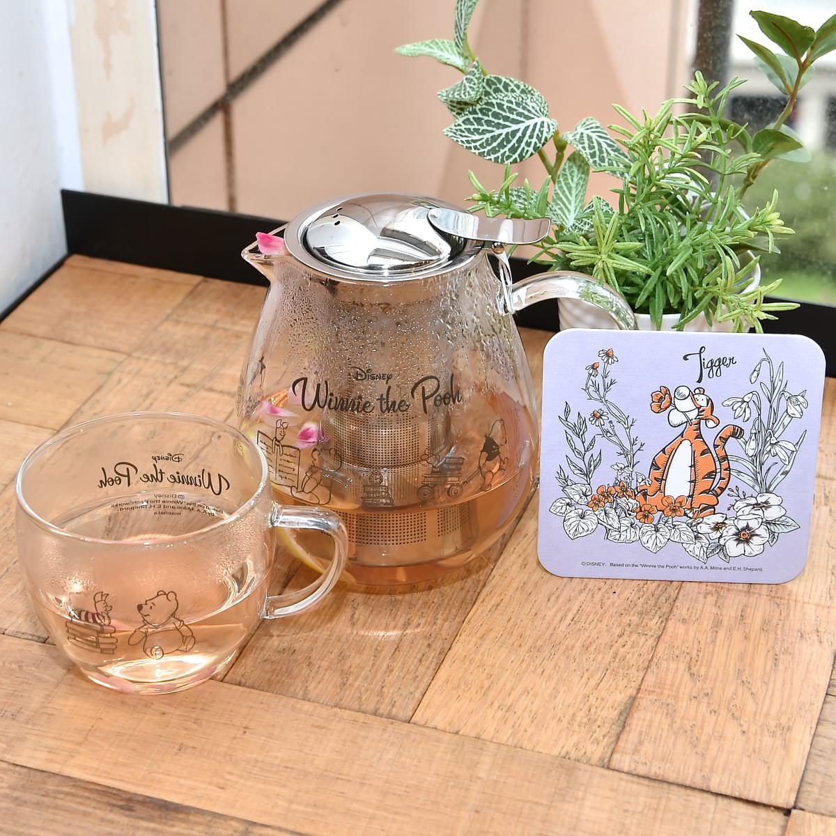 STORY STORYでのみ購入可能な「くまのプーさん」限定グッズと、「はちみつカフェ」の期間限定オリジナルメニューで使用する食器やグラス類。