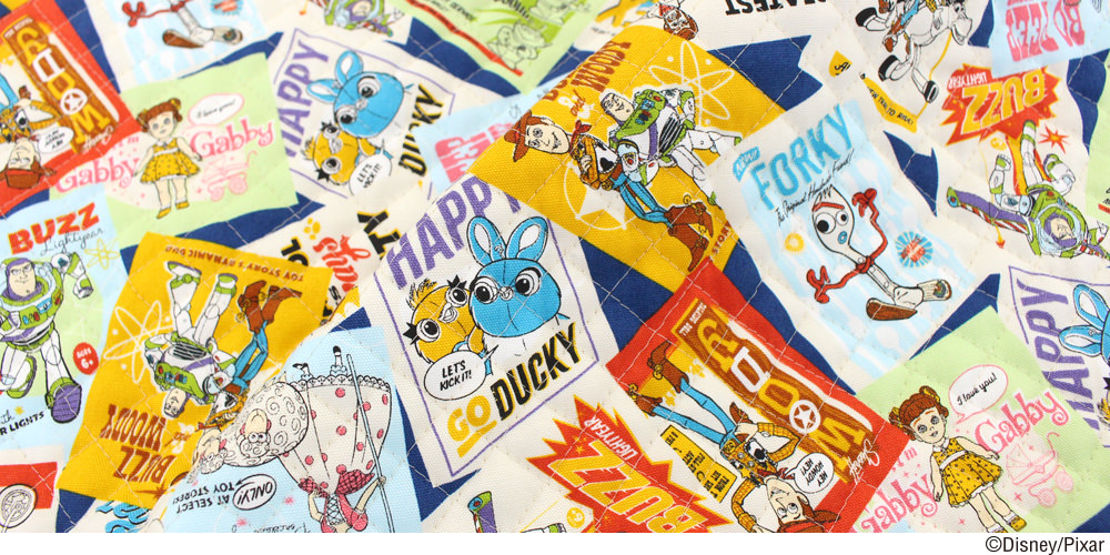 生地には「ウッディ」や「バズ・ライトイヤー」「ジェシー」「リトル・グリーン・メン」「ボー・ピープ」をはじめ最新作の新キャラクター「フォーキー」や「ダッキー&バニー」たちがポスターになってコラージュされたデザインが採用されています。