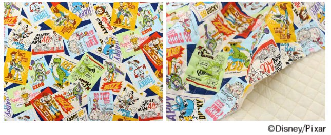 「トイ・ストーリー」の人気キャラクターたちが総柄でプリントされた「オックス生地」と「オックスキルト生地」