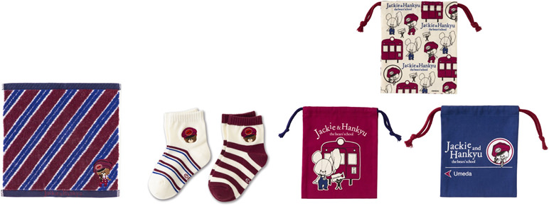 駅長さんスタイルが愛らしい「ジャッキー」がデザインされたミニタオル、キッズソックス、きんちゃく袋も登場。