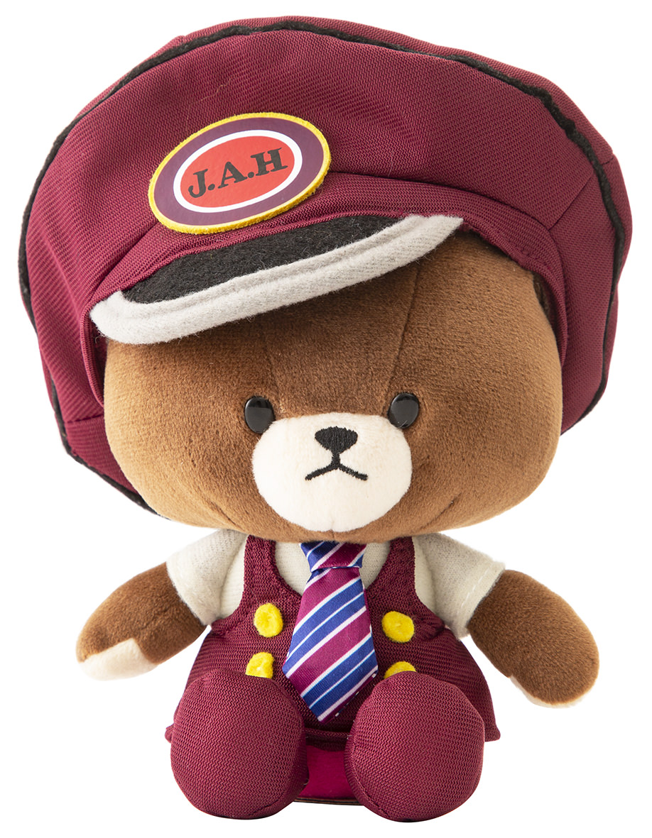 駅長さんスタイルの「ジャッキー」のやわらかぬいぐるみ。